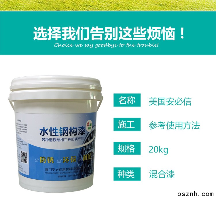 安必信新材料科技以信誉为本,以质量为根,以服务为体的经营原则,经过公司不断的科研和技术改革创新,拥有了国内一体化的生产和管理。水性钢构漆以其优良的品质和完善的服务体系畅销北京;重庆;安徽;广西;吉林;新疆;福建;宁夏;云南;黑龙江;辽宁;山西;四川;河北;香港,通过批发;零售;直销;厂家直销;实体店销售;网上销售的形式向客户供应优质的水性钢构漆,同时还为需求客户提供了陆运;水运;公路运输;铁路运输的物流方式发送货物,优质的产品会证明与我们合作是您明智的选择。